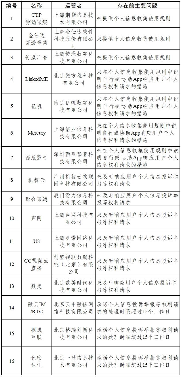 二、CTP穿透采集、金仕达穿透采集等16款SDK收集使用个人信息,存在未提供个人信息收集使用规则,未说明自行或协助App响应用户个人信息权利请求的措施,未及时响应用户个人信息投诉举报等权利请求等问题(详见下表)。