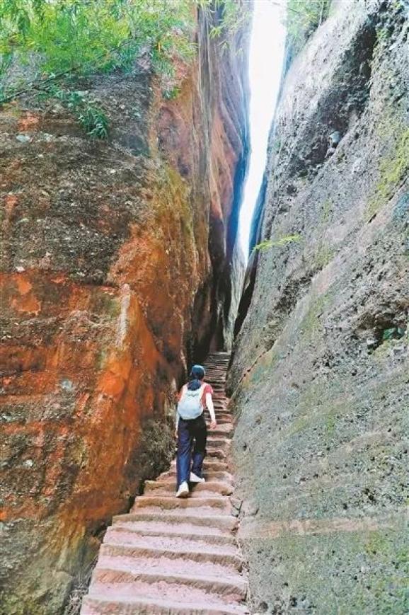 丹霞山一线天美景。广州日报新花城记者 顾展旭 摄李永茂的家乡在河南南阳,有座山叫丹霞,思念故乡的李氏兄弟买下山后,见山岩色如渥丹、灿若明霞,与家乡的山十分相似,故也把仁化的山定名为“丹霞”。从此,丹霞美名来到了岭南。