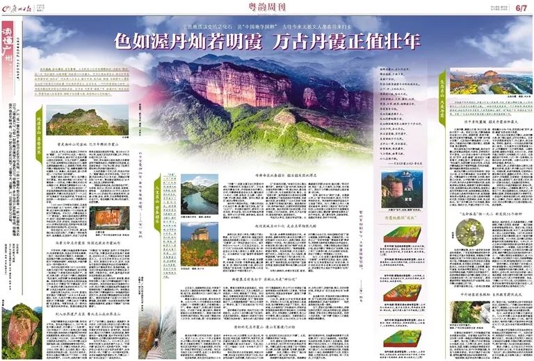 南岭巍巍,盆岭镶嵌,层峦叠嶂。大自然用上亿年的精雕细刻,将盆地“雕刻”成一片“色如渥丹,灿若明霞”的胜景——丹霞山。它不仅是地质名山,是亿万年来地质演变的“活化石”;它也是人文名山,数千年来,张九龄、韩愈、苏轼等文人墨客来此写下岭南文化的故事;它还是科学名山,近百年来,一代代科学家接力研究,让中国丹霞这张中国名片响彻全球。近年来,它更是“绿美广东、和谐共生”的生态名山,学者与游人纷至沓来,领略万古丹霞之美,品味神仙之宅的魅力。