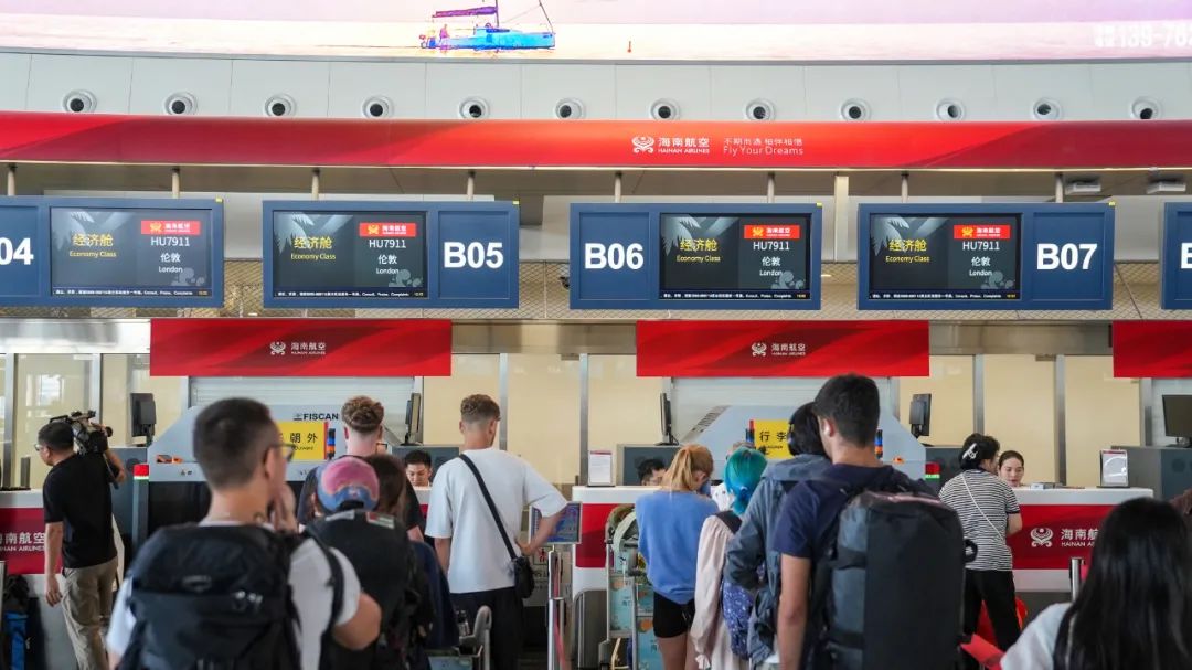 海口至伦敦首航航班旅客有序办理值机手续。海南航空供图此外,自2024年2月9日起,中国扩大了59国人员免签入境海南事由,因旅游、商贸、访问、探亲、医疗、会展或体育竞技等需求入境,可以免签在海南停留不超过30天。海南航空在海南拥有丰富的国内航线网络,包括海口至北京、上海、广州、深圳、重庆、成都、杭州、南京、西安、乌鲁木齐等近60条航线,极大地满足海南及全国各地旅客“一程多站”中转至国际航班的需求。