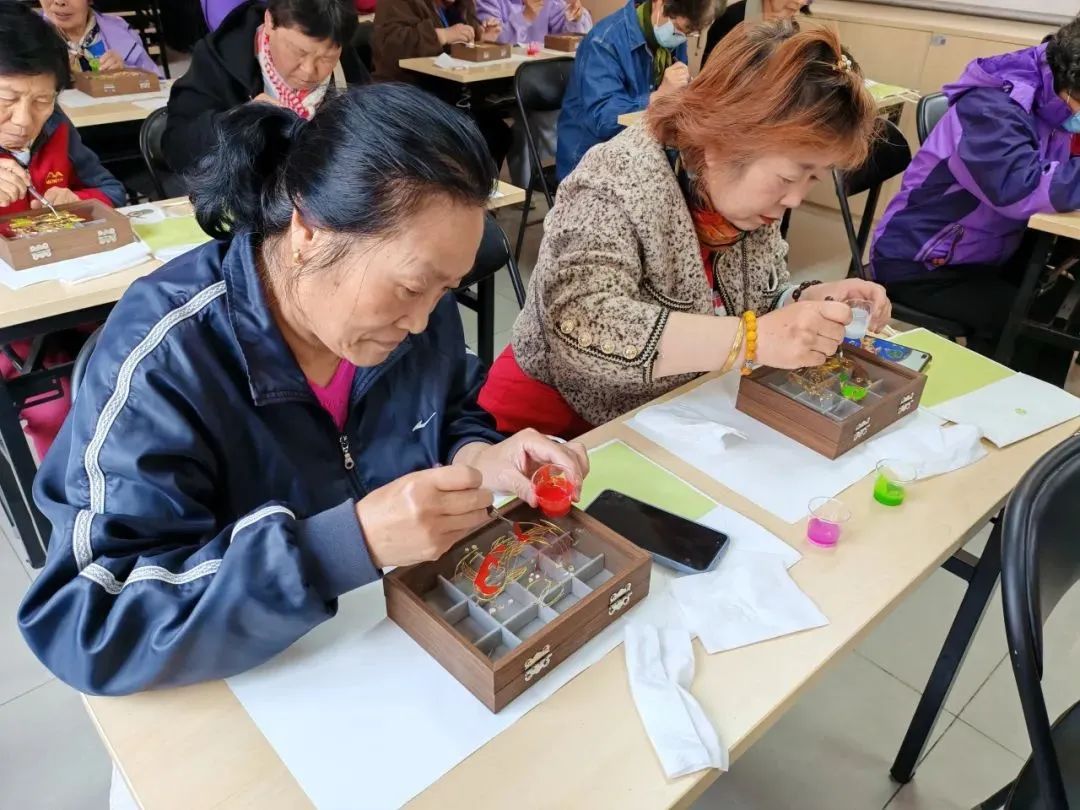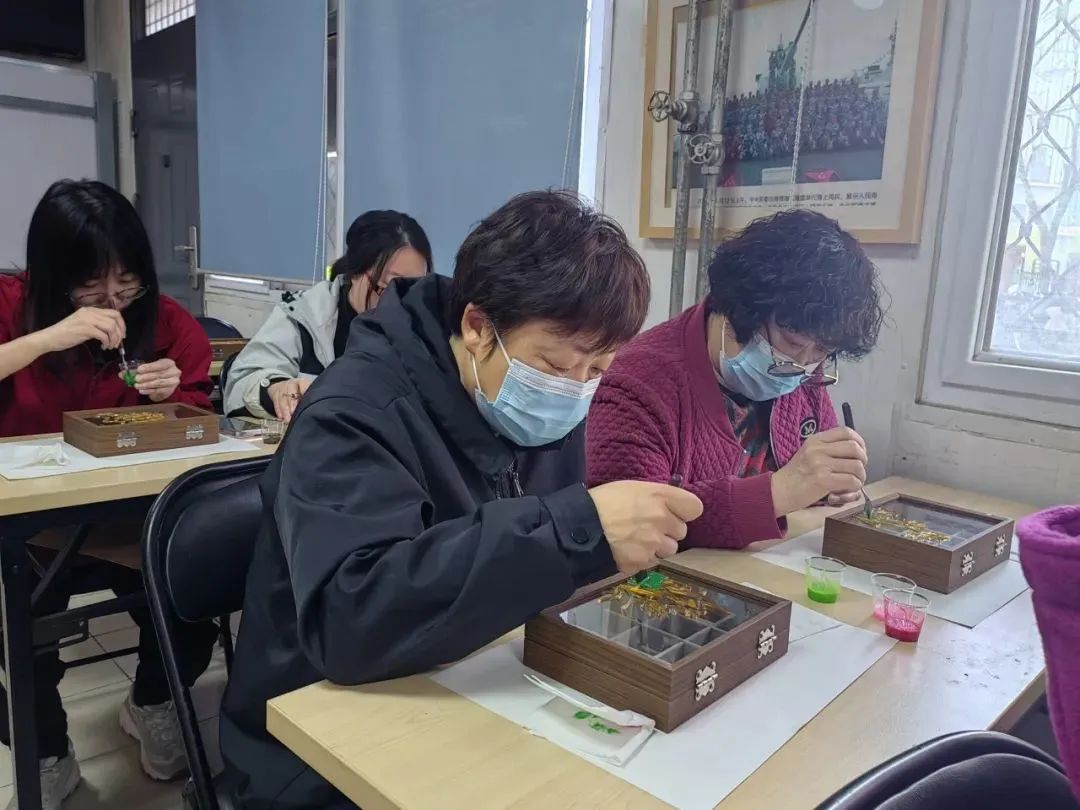 在传统文化体验中,掐丝珐琅首饰盒制作活动吸引了众多居民参与,大家在细腻的掐丝与绚丽的色彩中,感受传统工艺的独特魅力。