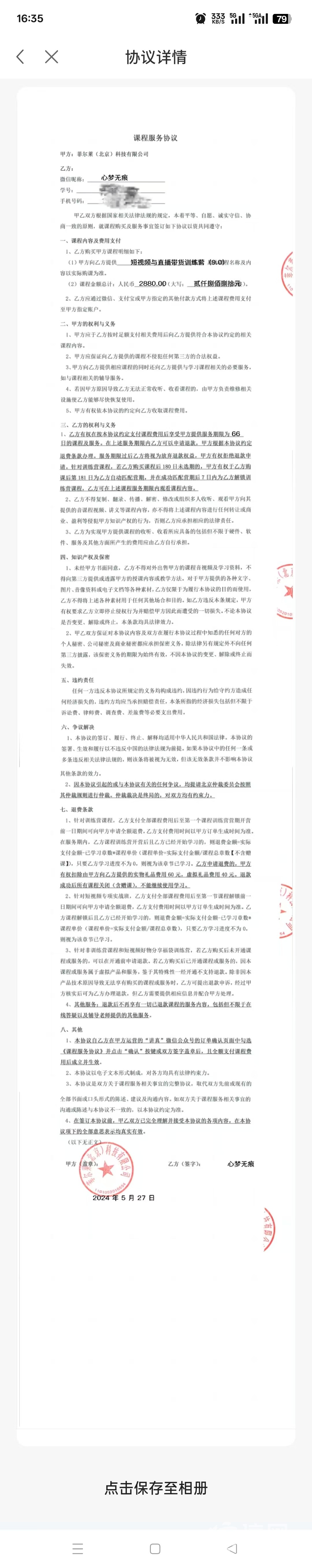 信网查阅赵先生提供的协议截图,发现其中一条款明确:“在服务期内,乙方课程训练营开营后且乙方已经开始学习的,则退费金额=实际支付金额-已学习章数*课程单价,只要乙方学习进度不为0,则视为该章节已学习。”而关于签署流程,赵先生表示,报名时仅通过微信支付,未收到任何纸质或电子合同,“连注册账号时都没让勾选协议,现在突然拿出一份‘隐形协议’,这不是霸王条款吗?”