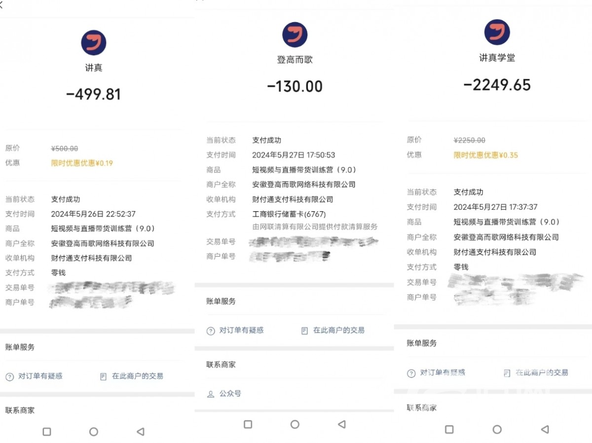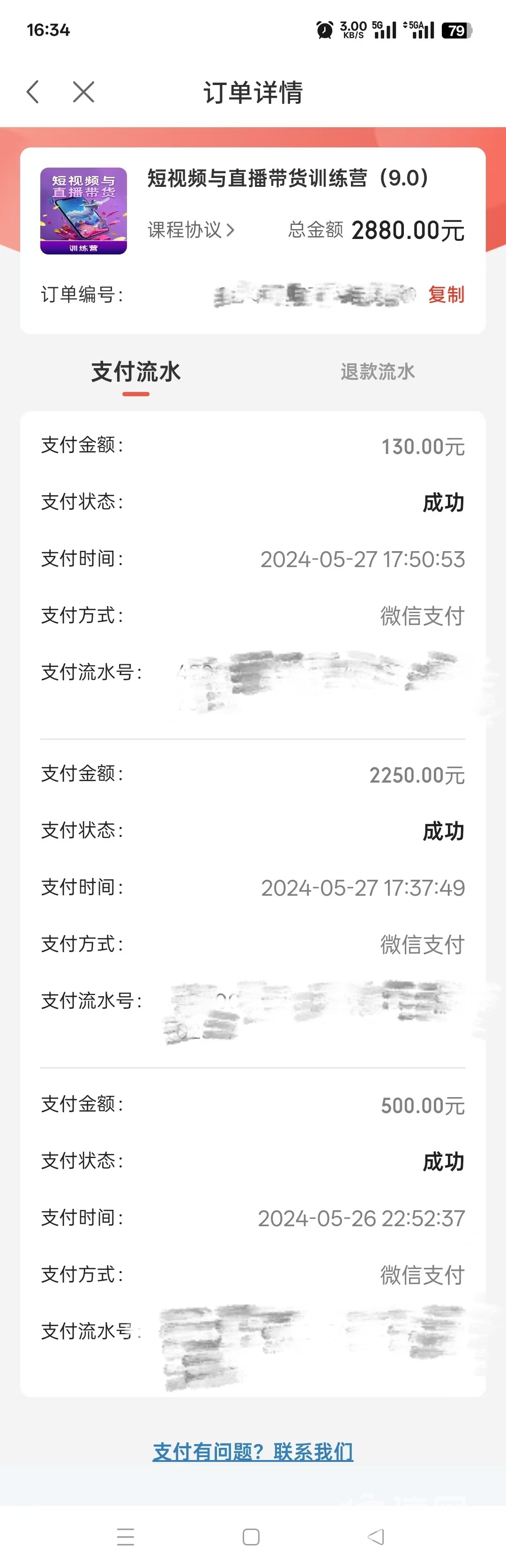 因手头资金紧张,赵先生与客服协商分期支付。从赵先生的支付记录中发现,当年5月26日,他通过课程老师微信发送的二维码先付了500元,次日又分别付了2250、130元学费,共计2880元。据赵先生介绍,这些钱都是他硬着头皮向亲戚朋友借的。“当时没多想,觉得正规平台应该没问题,但是上到后面发现老师讲的内容全是剪映的基本操作,比如图片怎样加文字、图片有水印怎么去掉之类的。在课程的后期,直播里的老师又开始推销价值2499元的‘短视频高阶训练营3.0’,说能教爆款视频制作和带货技巧。”想到能更快实现赚钱目标,赵先生再次选择借钱分期付款,在6月28日分1349元、1150元两次支付。