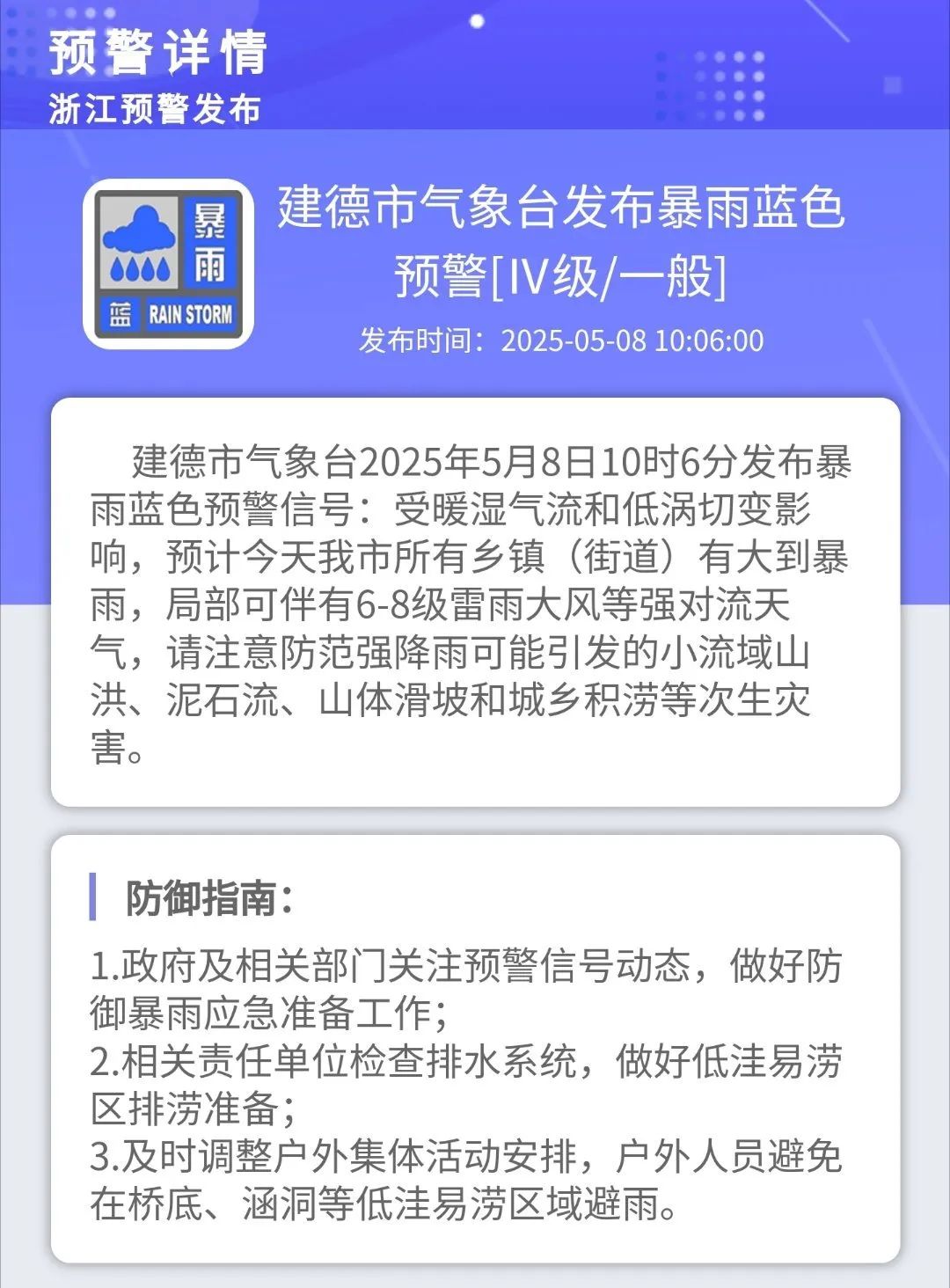 浙江省自然资源厅、浙江省气象局2025年05月08日09时23分联合发布地质灾害气象风险黄色预警:05月08日08时至05月09日08时,杭州市(淳安县、建德市)、衢州市(柯城区、衢江区、常山县、开化县、龙游县、江山市)等部分地区地质灾害气象风险较高(黄色预警)。请密切关注雨量情况,做好地质灾害防范工作。