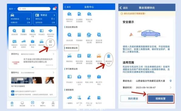 发生交通事故后,当事人只需打开“交管12123”APP【事故视频快处】功能,公安交管部门接警人员即可与当事人视频连线,“线上见面”远程完成轻微事故的快速取证和认定,以提供最快捷的事故处理服务。