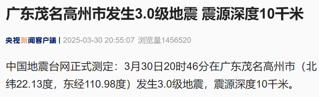 3月30日20时46分在广东茂名市高州市发生3.0级地震。