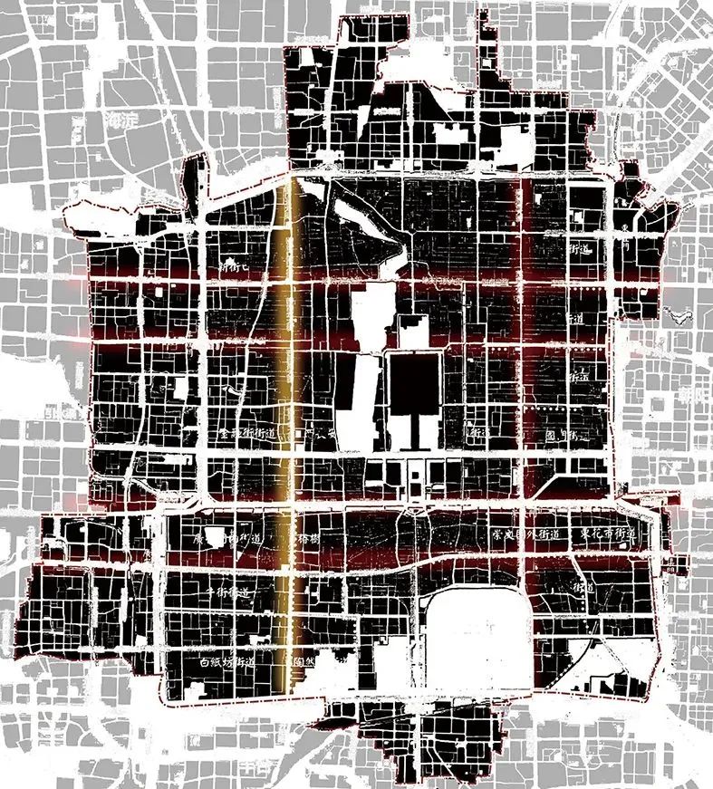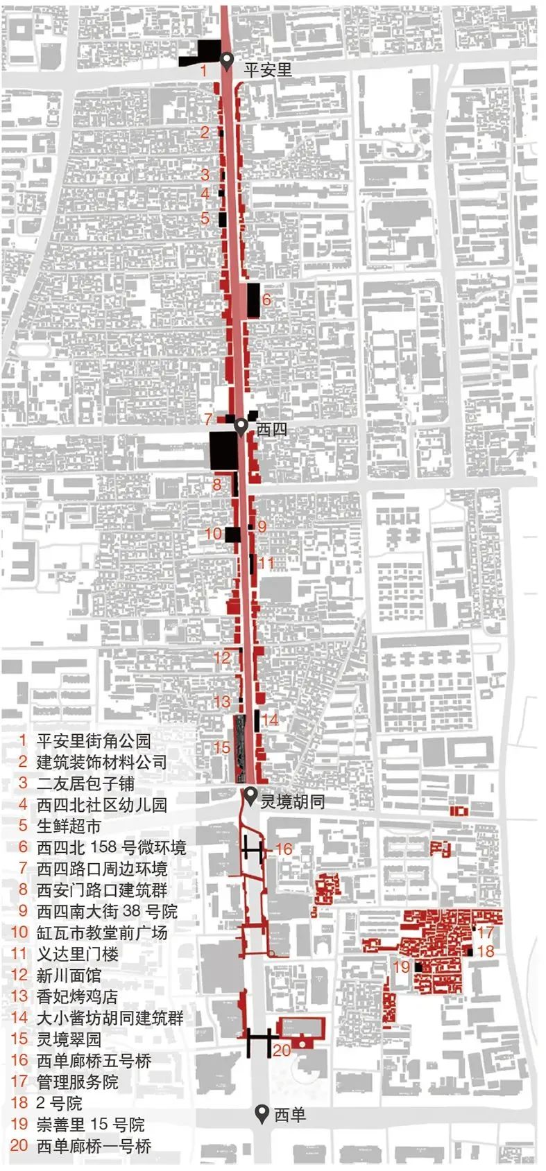 在核心区控规中,西单北大街一线被定义为北京老城空间格局“四横两纵”中重要的纵线之一,是核心区空间结构的重要要素和内环路核心骨架(图1)。西城区政府也把推动西单北大街一线的城市更新工作作为落实新总规和核心区控规的重要举措。西单到积水潭桥这一段路全长4.5km,由西单北大街、西四南北大街和新街口南北大街组成。其中西单北大街和西四南北大街一线紧邻“皇城”,沿线既有重要的历史文物,也有典型的传统肌理和老城生活场景;在空间形态上,既有聚集着各种商家店铺、服务街坊四邻和老城生活、保留传统尺度的西四南北大街,也有面向各地顾客、现代尺度的西单商业街区,还有一片在西单和府右街之间的以居住功能为主的力学胡同传统平房片区。