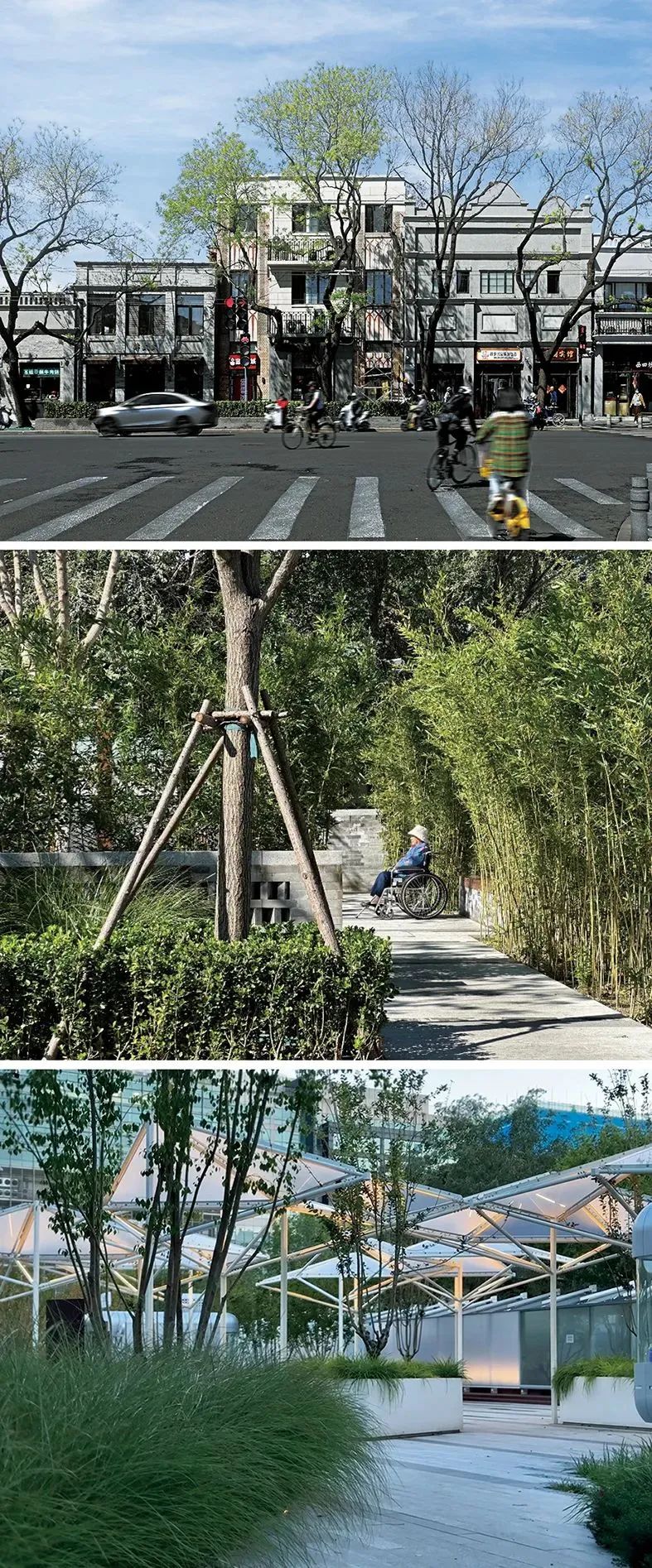 一是“环境—地方”。这些更新工作都在北京市西城区,我们设计院是西城区属地的企业,我也住在西城区,有的同事就在西城区长大,西城区就是我们身边的环境,大家对于西城区的生活氛围和发展变化都非常熟悉。每天上班下班,接送孩子上下学,晚上出门散散步,周末去老城走走,有时在路上遇到一些问题,作为市民也会抱怨两句,也在想这些公共环境中的设计该如何去做,但“红线”外的事,以前我们真插不上手。这几年的更新工作让我们有机会去讨论和处理这些问题,过去的生活经验和记忆以及对于身边环境的感情和责任还是会涌现出来,不断地给我们提示和帮助。这和为一个新建项目,去一片陌生的场地调研所获得的信息和体验是截然不同的,因为我们的身份不仅是建筑师,也是生活在这儿的老百姓。