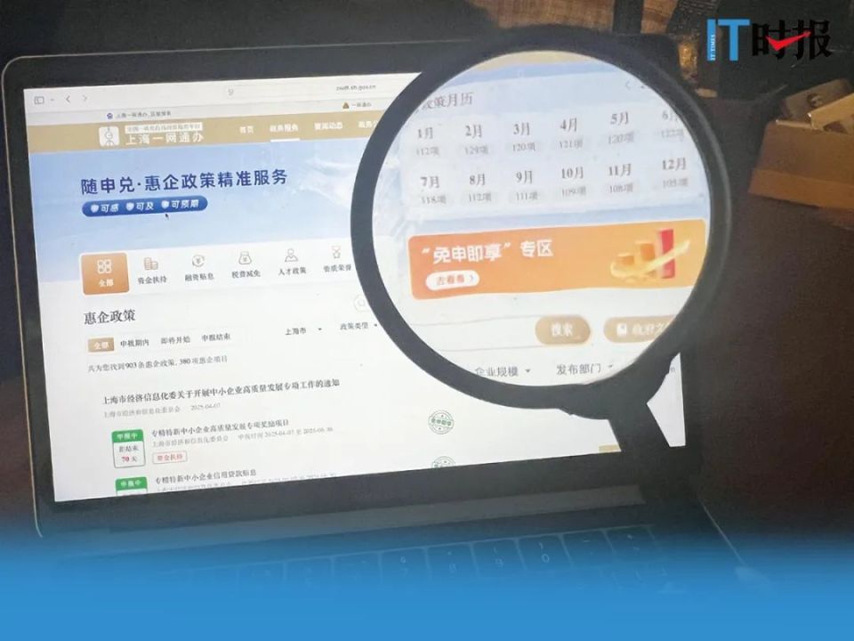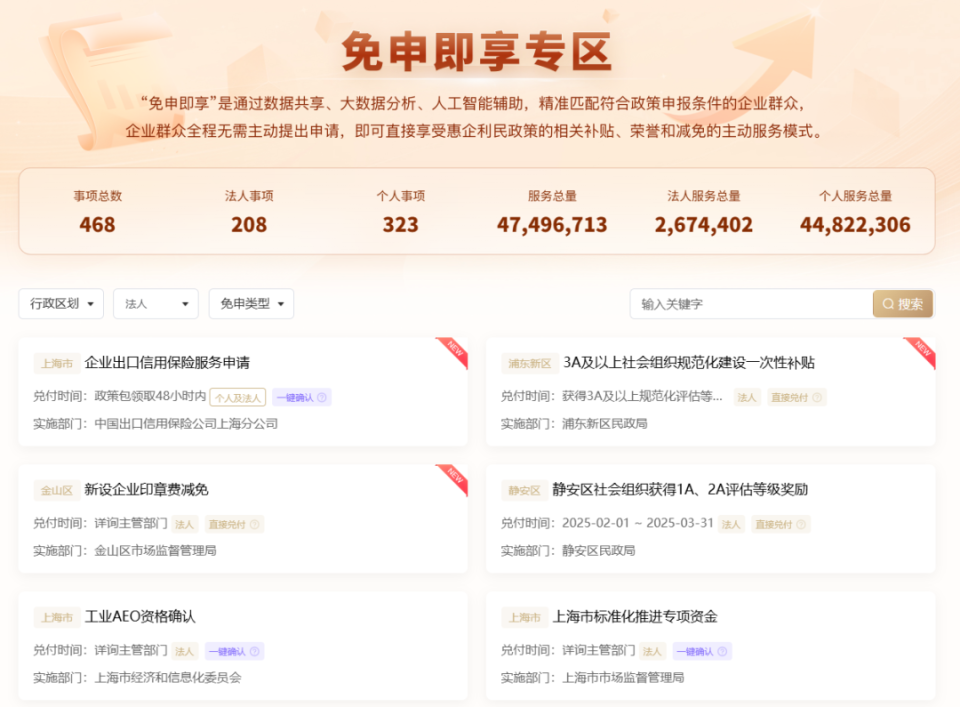 《IT时报》记者在上海市“一网通办”网站上看到,在“惠企政策精准服务”专区中有“免申即享”专区,可办理468个事项,服务总量超过4700万次,其中法人服务总量超过2600万次。在筛选栏里选择区域、服务对象等条件,可以找到“免申即享”的项目详情,包括免申条件、兑付时间、办理流程等。比如浦东新区的“院校创业指导成效补贴”,在浦东新区范围内经上海市就业促进中心和上海市学生事务中心年度评估达到A级、B级或C级的院校创业指导站,在接收到项目“免申即享”消息后按流程确认资金申领意愿即可,无须主动申请,也无须提供申请材料。