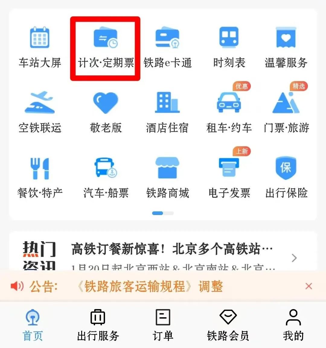 以12306App为例,点击进入App首页,点击“计次·定期票”。