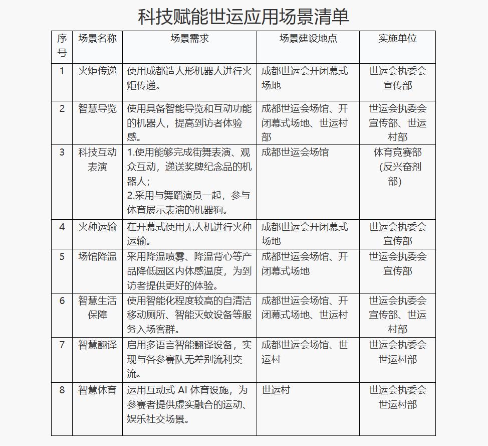 科技赋能世运应用场景清单。截图自成都市科学技术局网站事实上,今年2月,成都世运会执委会便释放过一次信号:启动科技产品征集,以“需求牵引、场景验证”为轴心,构建一条从技术征集到政策支持的完整链条。当时,成都市科技局联合世运会执委会发布《科技赋能成都世运会相关产品征集通知》,面向所有企业征集涵盖场馆建设、运营保障、辅助训练等6大类应用场景,如能耗监测系统、巡检机器人、AI智能问答机器人等。