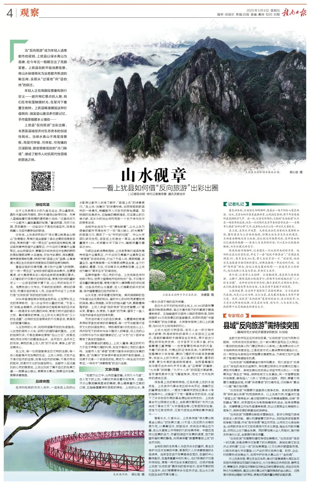 “反向旅游”突围要打造差异化竞争优势。县域旅游要善用“非标准化资源”构筑独特卖点。以上犹县为例,可重点打造“森宿上犹”等特色IP,通过短视频平台开展精准营销;创新“茶旅融合”模式,将茶园观光与电商销售有机结合,延伸消费链条。关键要建立开发负面清单制度,防止过度商业化稀释核心竞争力,保持资源的原真性和独特性。