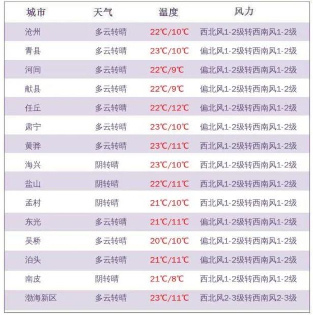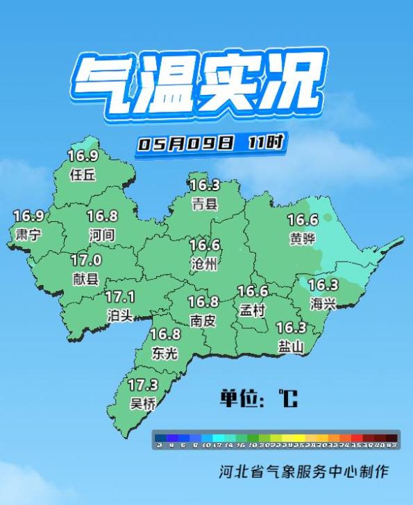 今天11时,沧州各县市气温多在16~17℃上下;和昨天同时刻相比,各县市气温大都比昨天下降了2~6℃左右,青县降幅最大(↓6.4℃)。