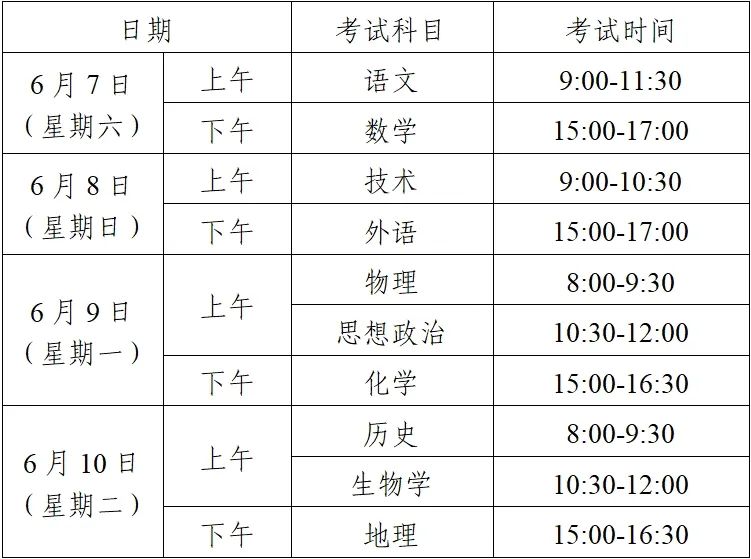 外语分为英语、日语、俄语、德语、法语、西班牙语,由考生从中选定1个语种参加考试。各语种均含听力考试。选考科目由考生根据本人兴趣特长和拟报考学校及专业的要求,从思想政治、历史、地理、物理、化学、生物学、技术(含通用技术和信息技术)等7门科目中,选择3门作为高考选考科目。各科目考试时间如下: