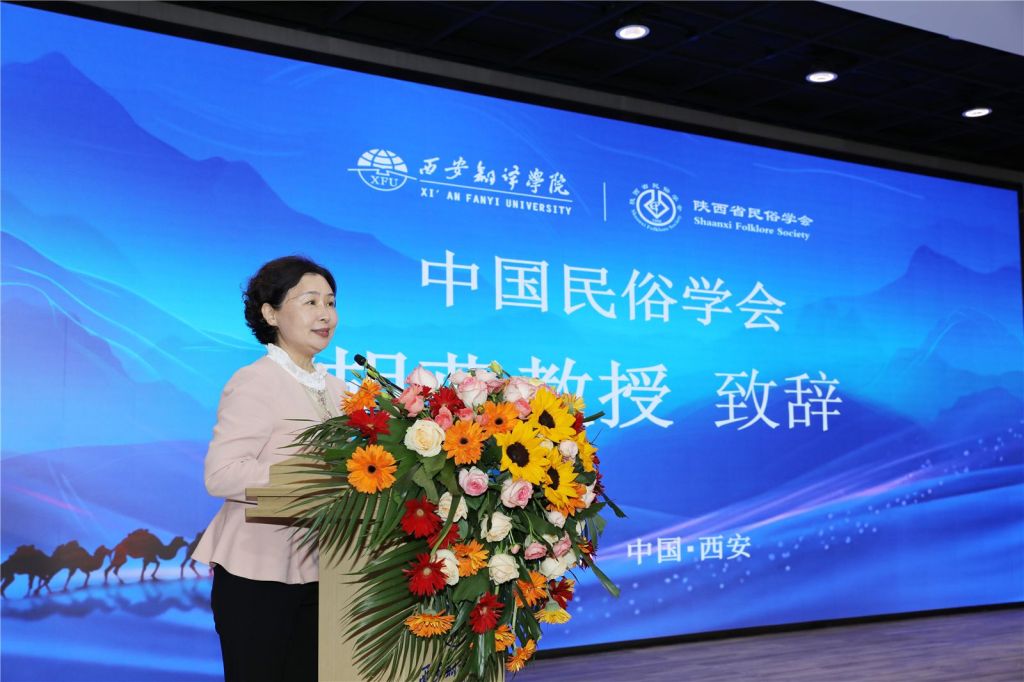胡燕在致辞中首先宣读了中国民俗学会会长叶涛对此次研讨会的贺信,并表示,丝绸之路作为沿线各国家地区人民交流互鉴的千年纽带,不仅承载着商贸往来,更是民俗文化交流的璀璨长廊。胡燕强调,西安翻译学院充分发挥国际化平台优势,为跨文明对话搭建桥梁;陕西省民俗学会始终秉持学术担当,在区域文化研究领域深耕协同创新模式;中国民俗协会始终高度重视合作创新。近年来,三方共同在非遗保护传统节日研究等领域取得了丰硕的成果。此次研讨会也标志着三方合作迈入新阶段,为新时代民族学会发展注入了全新的活力。胡燕期待以此次研讨会为契机,进一步加强在丝绸之路沿线民俗文化数据库建设、跨境文化比较研究等方面深入合作,共同谱写丝绸之路沿线民俗研究的新乐章。