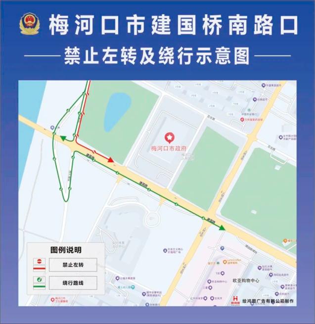 附图二:梅河口市建国桥南路口禁止左转及绕行示意图