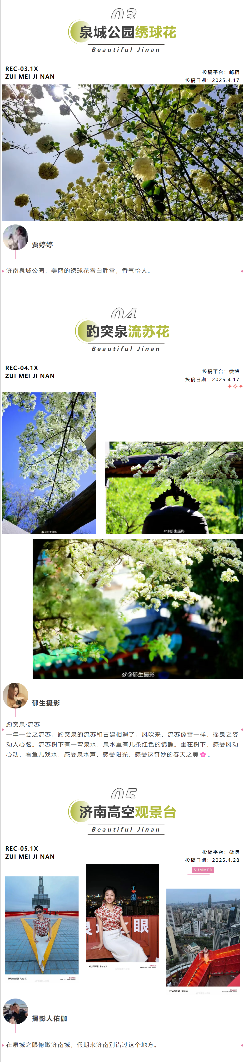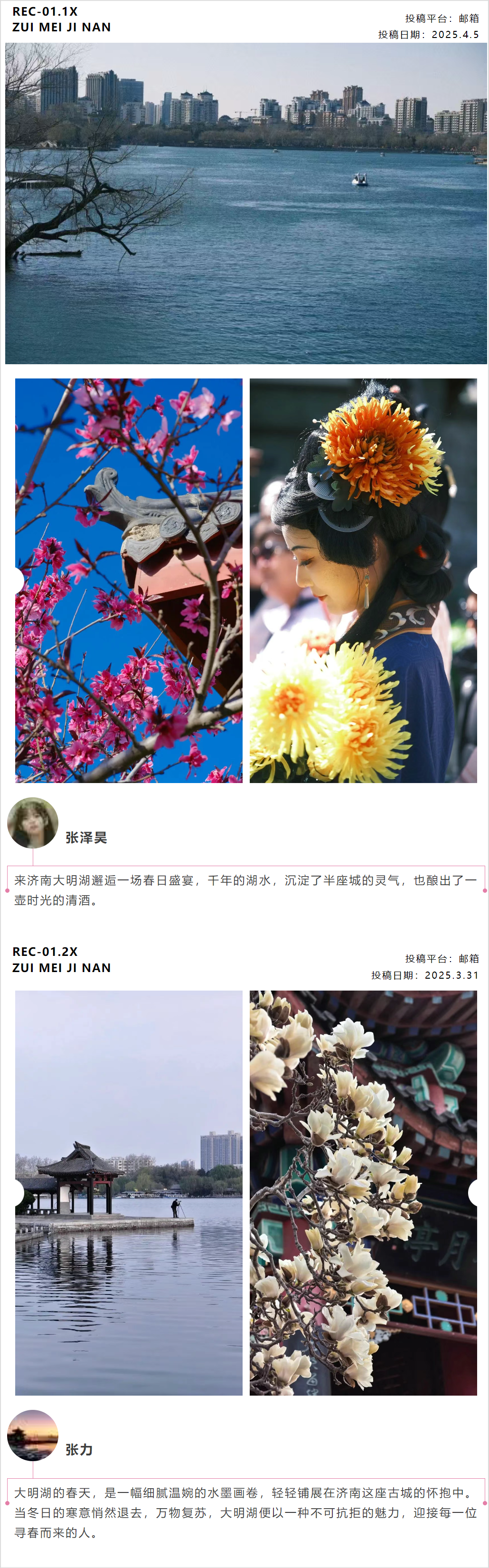 2.新媒体渠道投稿:网友可通过济南市文化和旅游局微信公众号、官方新浪微博、抖音等渠道私信投稿,私信请备注“发现最美济南”投稿+授权济南市文化和旅游局代为发布;