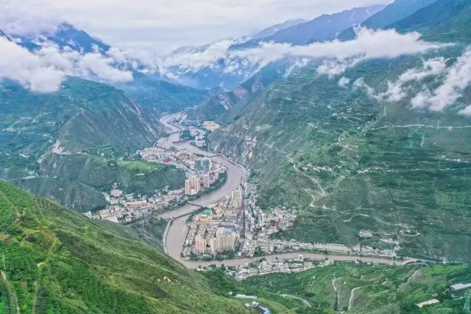 在四川彭州湔江河边战士趴在还没有修完的铁索桥上