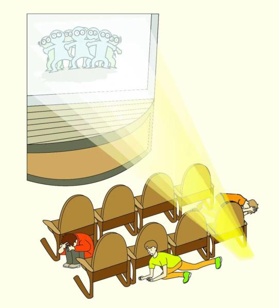 在影剧院、体育馆等处:就地蹲下或趴在排椅下;注意避开吊灯、电扇等悬挂物;用手或其他东西护住头部;听从工作人员指挥,震后有组织地撤离。