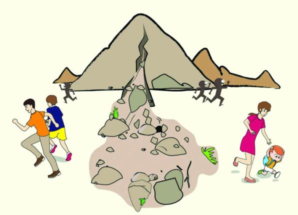 躲避山崩、滑坡、泥石流:遇到山崩、滑坡,要向垂直于滚石可能运动的方向跑,切忌顺着滚石方向往山下跑。也可躲在结实的障碍物下,特别注意保护好头部。迅速撤离到开阔,不会受崩塌、滑坡、滚石影响的地方避灾。