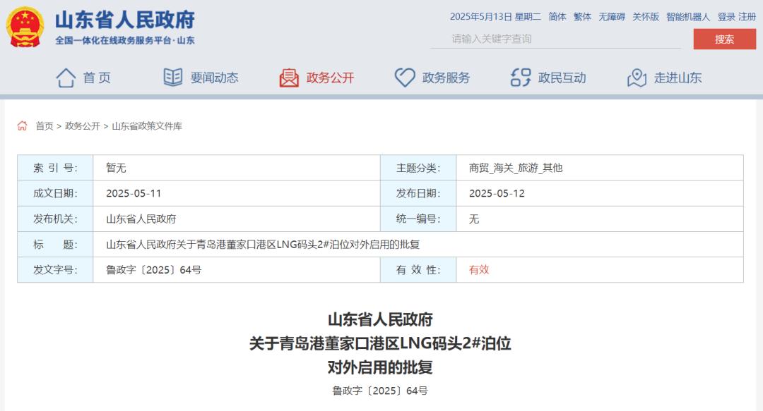 你市《关于青岛港董家口港区LNG码头2#泊位验收并对外启用的请示》(青政呈〔2025〕15号)收悉。经省政府有关部门和中央驻鲁口岸查验单位验收,青岛港董家口港区LNG码头2#泊位符合对外启用条件,批准其对外启用。