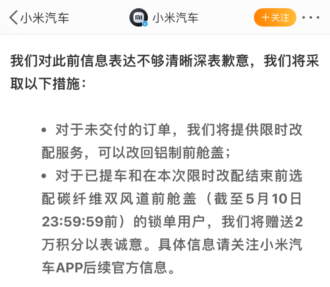 面对车主质疑,小米5月7日发布致歉声明,承认“信息表达不清晰”,并提供两种方案:未交付订单可改配铝制舱盖,但需重新排队30~40周;已提车用户赠送2万积分(价值约2000元人民币)。但部分消费者并不接受,该方案更被批“让消费者为企业失误买单”。