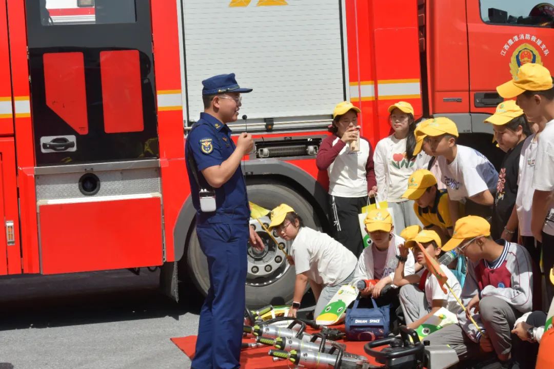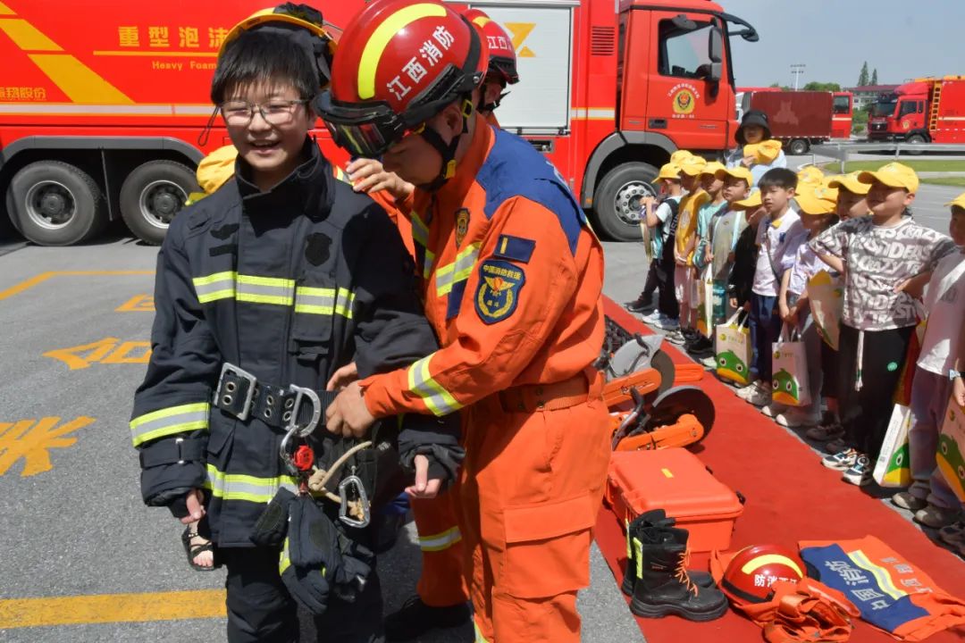 鹰潭5月12日,鹰潭市高新技术产业开发区消防救援大队邀请60余名小学生开展“消防队站开放日”活动。现场,小朋友们参观了各种消防器材,消防员详细介绍了各种消防车辆装备的名称和用途,并对部分消防器材进行了演示。在互动环节,小朋友们还穿上战斗服、戴上头盔,登上消防车,亲身体验当一次“小消防员”。