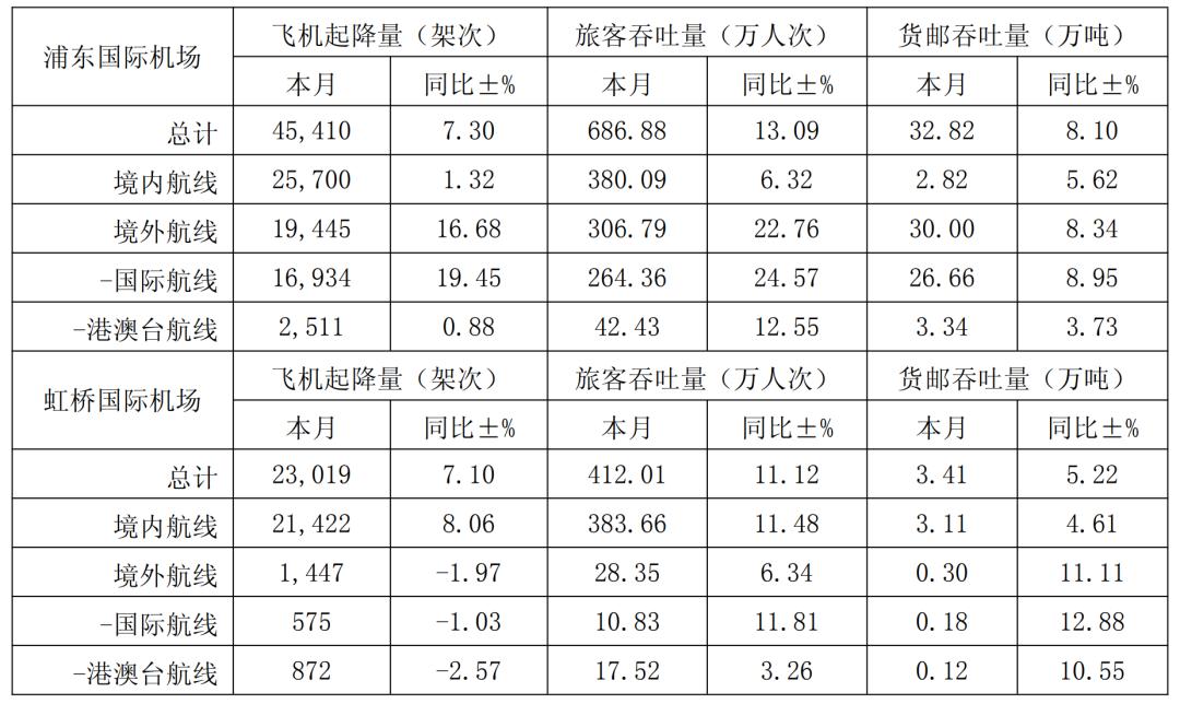 4月,浦东机场旅客吞吐量总计686.88万人次,同比增长13.09%;货邮吞吐量32.82万吨,同比增长8.10%,飞机起降次数45410架次,同比增长7.30%。