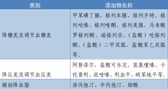 在普通食品或保健食品中添加格列美脲、盐酸二甲双胍、硝苯地平、利血平等成分。