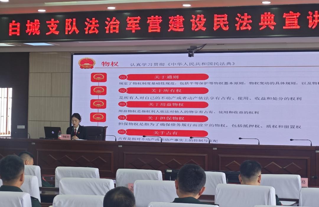 为进一步提升官兵法治素养,强化官兵法治思维,营造全体官兵尊法、学法、守法、用法的良好氛围。2025年5月9日,白城铁路运输法院受邀前往白城武警支队参加“白城支队法治军营建设民法典宣讲”活动,为参会的领导和官兵共计700余人进行民法典内容的解读。