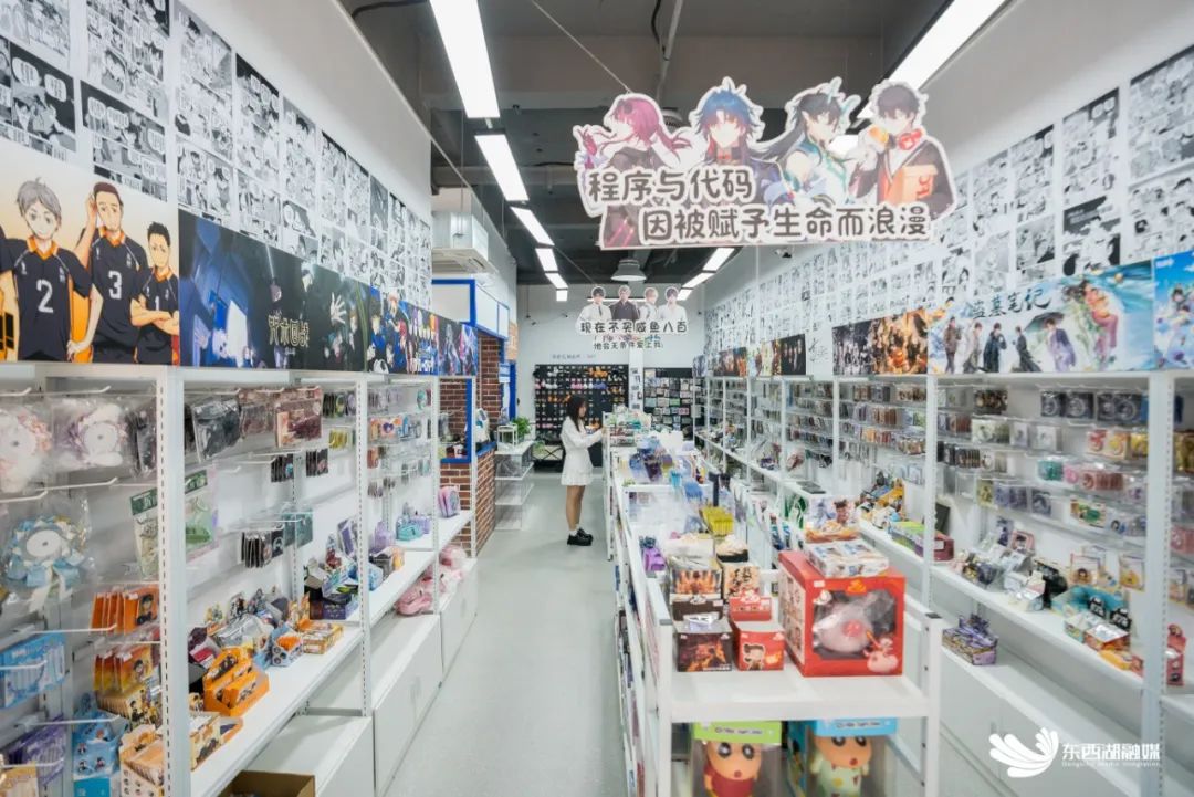 //店内商品琳琅满目。走进“次元谷”新店,最吸引人的是一面五彩斑斓的涂鸦墙。雷刚指着墙上密集的动漫图案说,“本来只是提供彩笔让顾客消遣,没想到成了最受欢迎的打卡点。”
