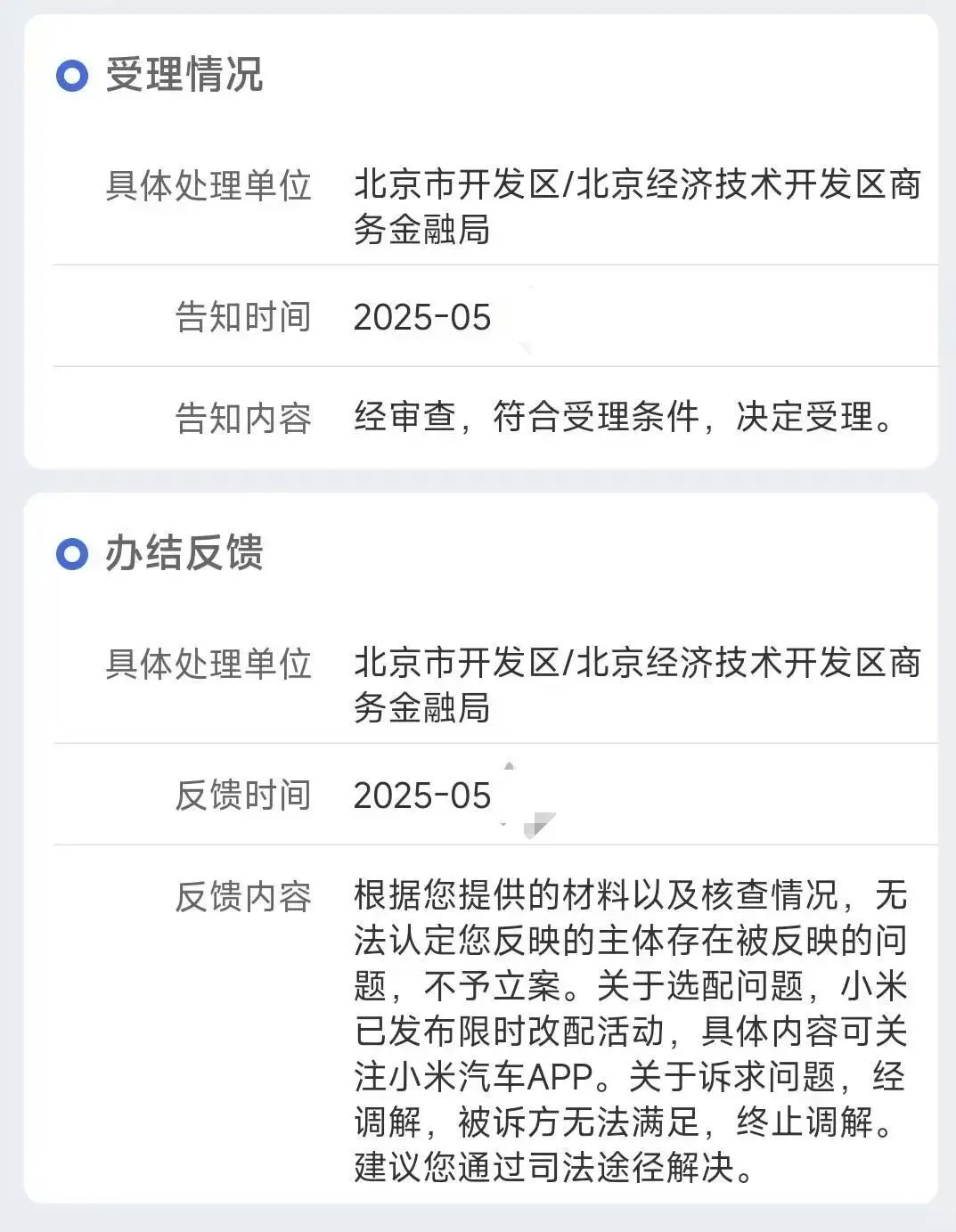 维权群内,不少准车主向记者讲述,他们将相关情况向小米汽车科技有限公司注册地承担区级市场监督管理部门相关职责的北京经济技术开发区商务金融局反映,但没有得到他们想要的结果。