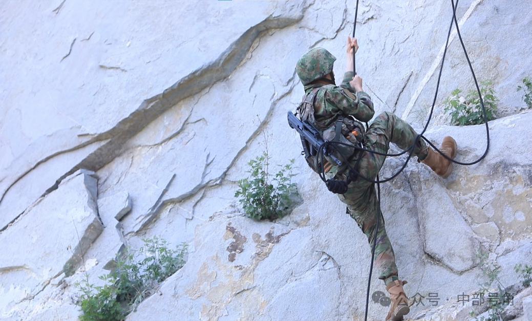 行军途中突遇陡峭断崖队员迅即抛掷抓钩、固定绳索