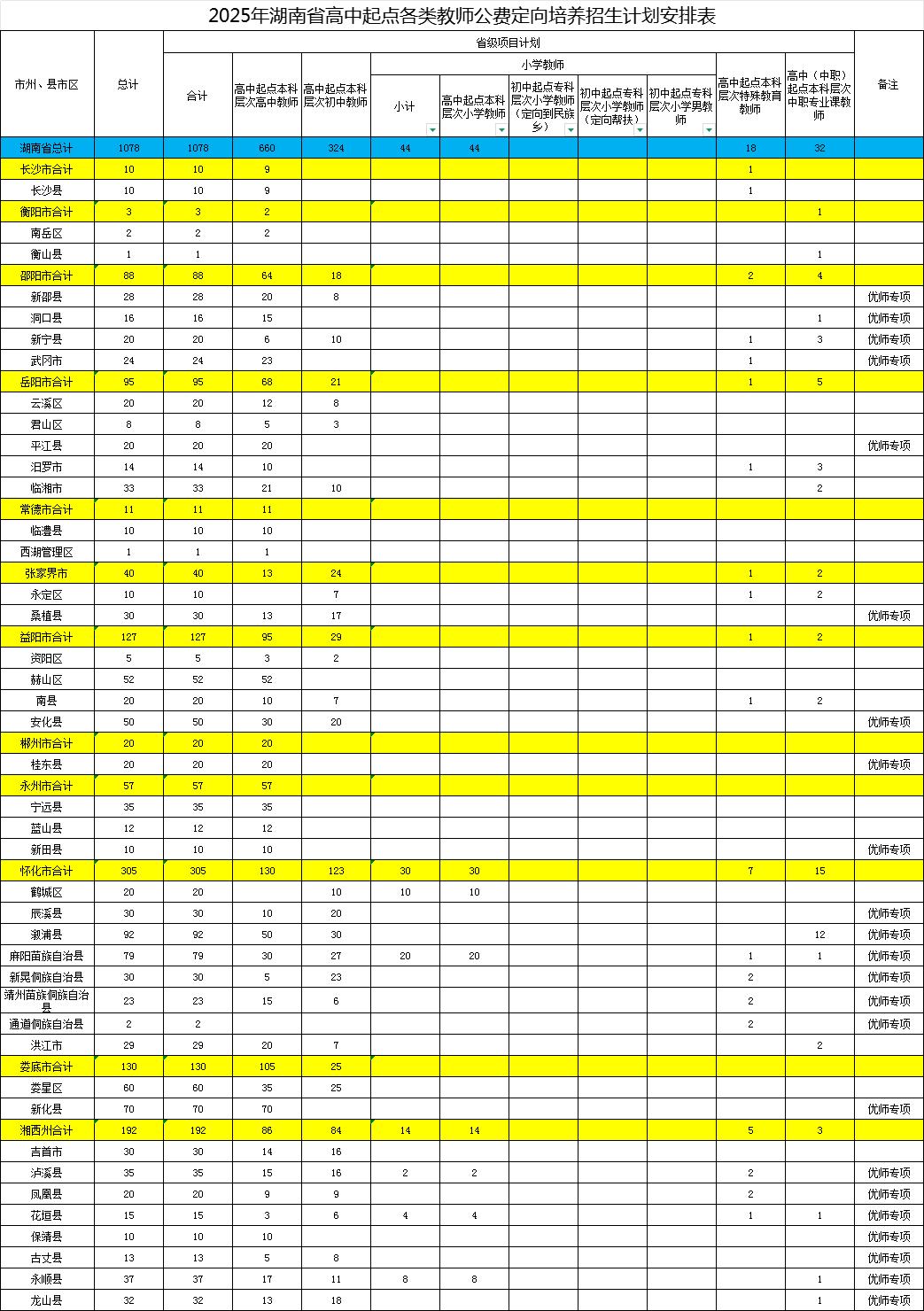 根据我厅《关于征集2025年湖南省公费定向师范生培养招生需求计划的通知》要求,以及各市州向我厅申报的2025年中小学教师公费定向培养招生需求计划,在综合平衡的基础上,我厅编制了高中起点各类中小学教师公费定向师范生招生计划。
