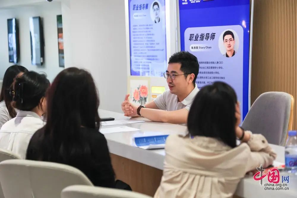 以AI夜校为支点,水贝社区形成了“产教融合赋能传统产业升级”模式,打造“技能培训+职业指导+创业指导+权益维护”四位一体的闭环式公共就业服务品牌。图为一名职业指导师正在对求职者进行指导。中国网记者 伦晓璇 摄