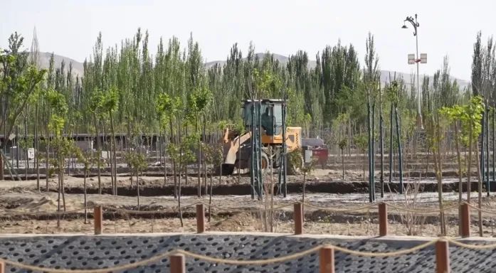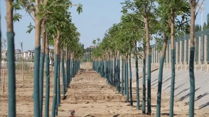 5月14日下午,记者走进已经初步成型的绿化区域,看到一排排新栽植的胡杨、白蜡和毛柳等树木挺拔而立,在微风中轻轻摇曳。丁香和连翘的幼苗也已破土而出,星星点点的嫩绿为这片土地带来了新的希望。工人们正忙碌进行基础铺装工作,为项目的最后完工做努力。