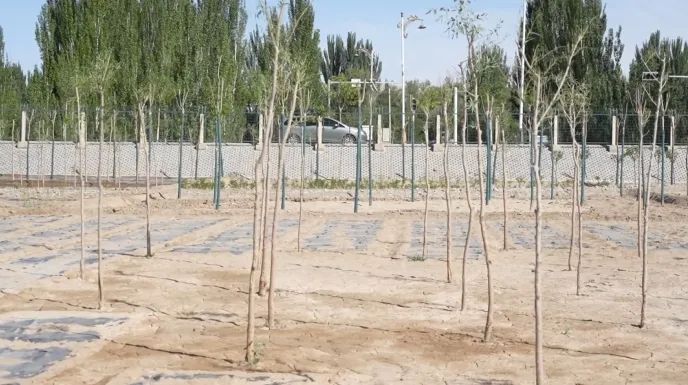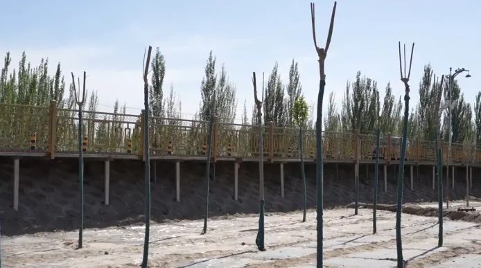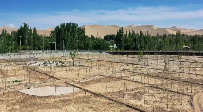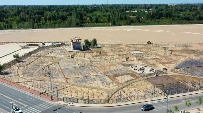 敦煌市园林绿化和环卫事务中心工作人员张敏说:“目前,已栽植胡杨1200余株,白蜡700余株,紫穗槐3000余株,丁香,连翘等乔灌木共计12000余株,现在正在进行平台铺装,主要以党河石、敦煌文化元素镶嵌为主,预计五月底完成,六月初投入使用。”