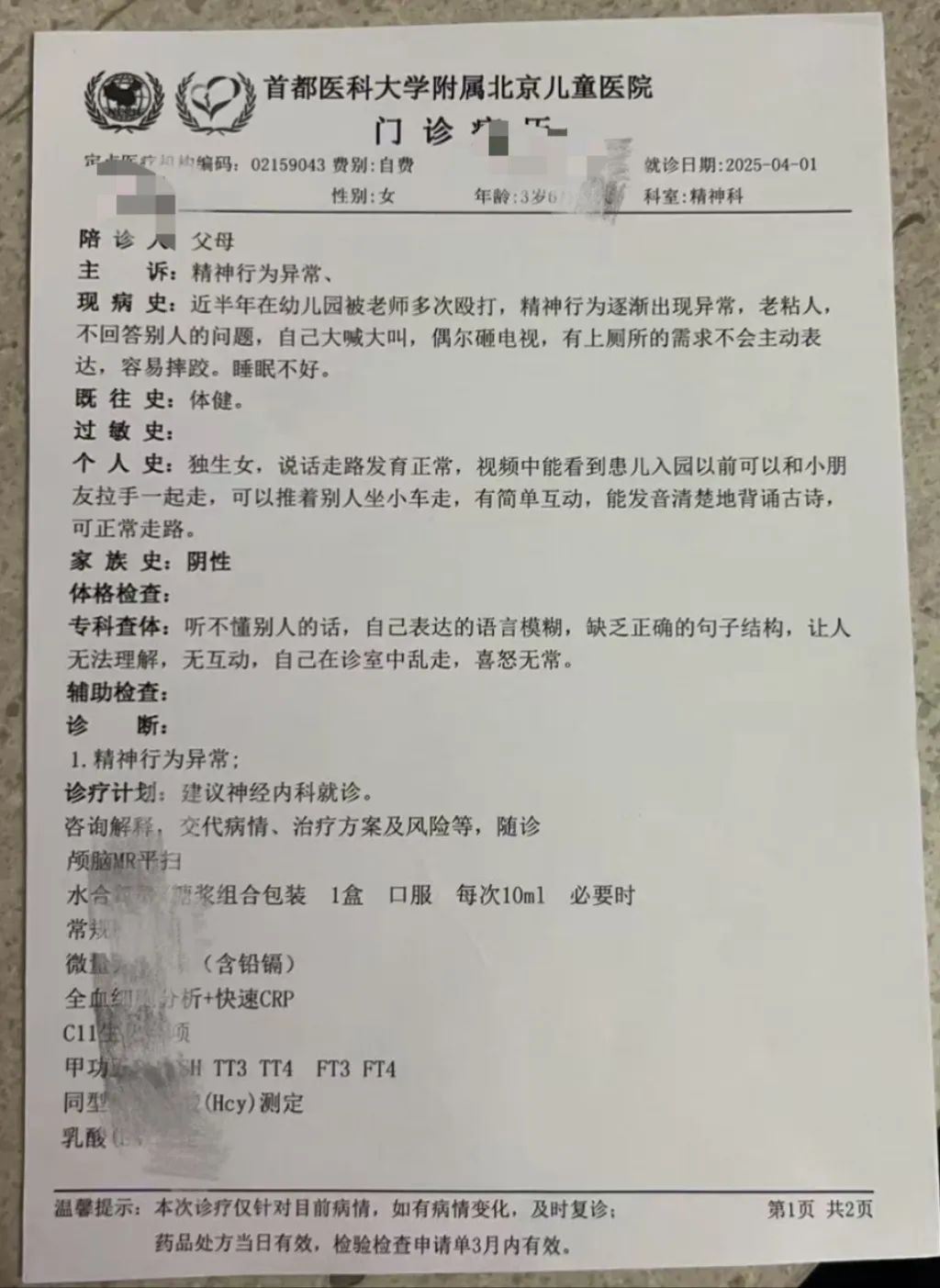 今年4月初,他带女儿去首都医科大学附属北京儿童医院精神科看诊。其提供的“门诊病历”载明:(幼儿)听不懂别人的话,自己表达的语言模糊,缺乏正确的句子结构......自己在诊室中乱走,喜怒无常。医生诊断为“精神行为异常”“建议神经内科就诊”。