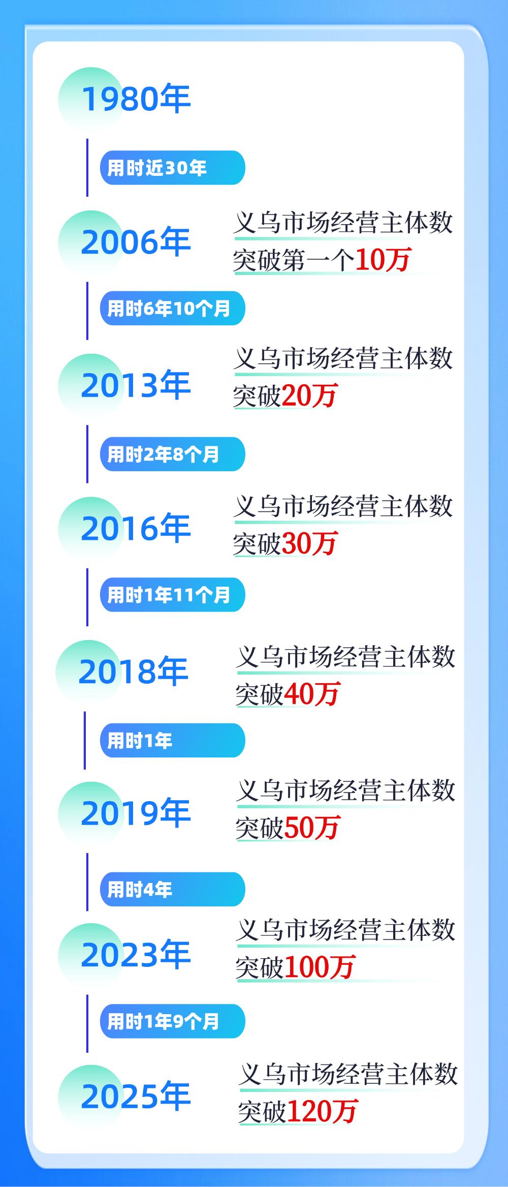 据统计,义乌市场经营主体总量突破第一个10万用时近30年,第二个10万用时6年10个月,第三个10万用时2年8个月,第四个10万用时1年11个月……义乌市场经营主体增长继续走在“快车道”。截至目前,全市市场经营主体总量超过120万户,位居全国县级区域第一。亮点二