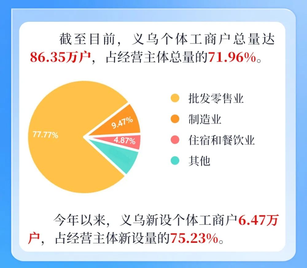 在义乌“小商品、大市场”的发展格局中,个体工商户聚变成推动经济高质量发展的“蚂蚁雄兵”,展现出蓬勃的生机活力。截至目前,全市个体工商户总量达86.35万户,占市场经营主体总量的71.96%,主要分布在批发零售业(占比77.77%)、制造业(占比9.47%)以及住宿和餐饮业(占比4.87%)等。今年以来全市新设个体工商户6.47万户,占市场经营主体新设量的75.23%。亮点三