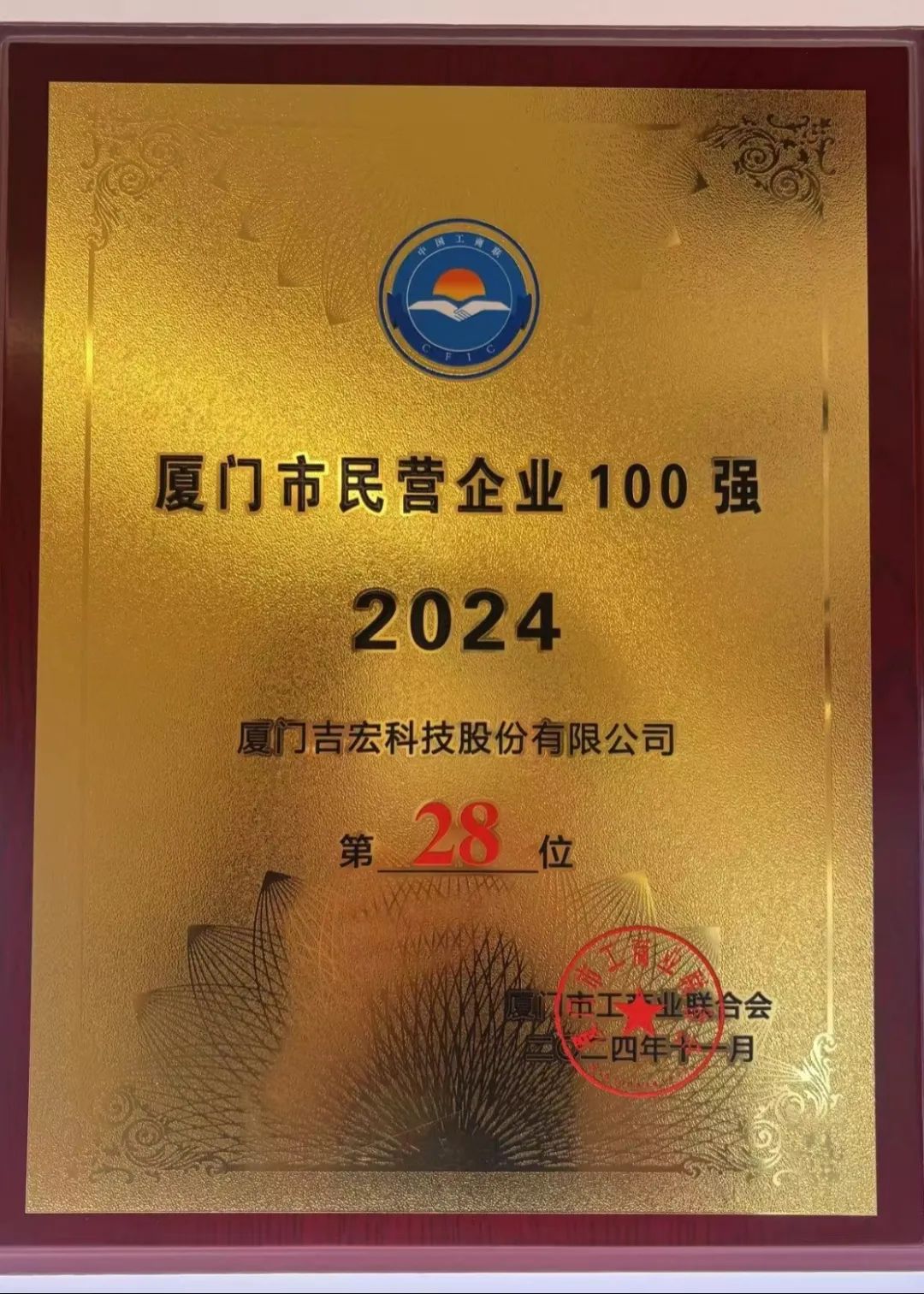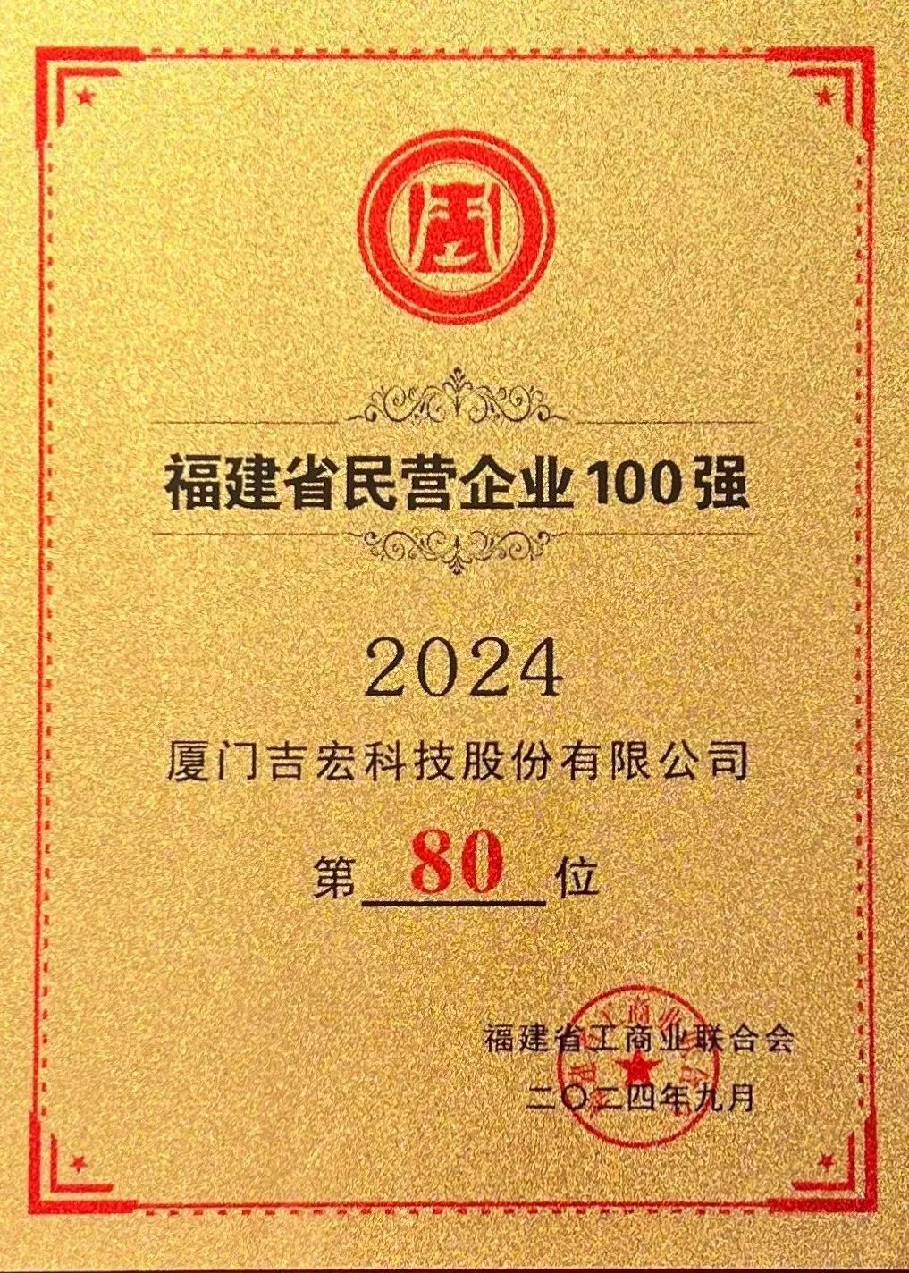吉宏股份荣获2024年福建省民营企业100强第80位,2024年厦门市民营企业100强第28位。