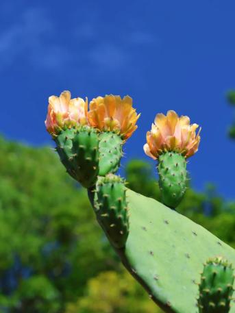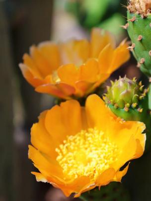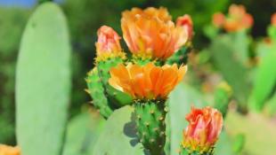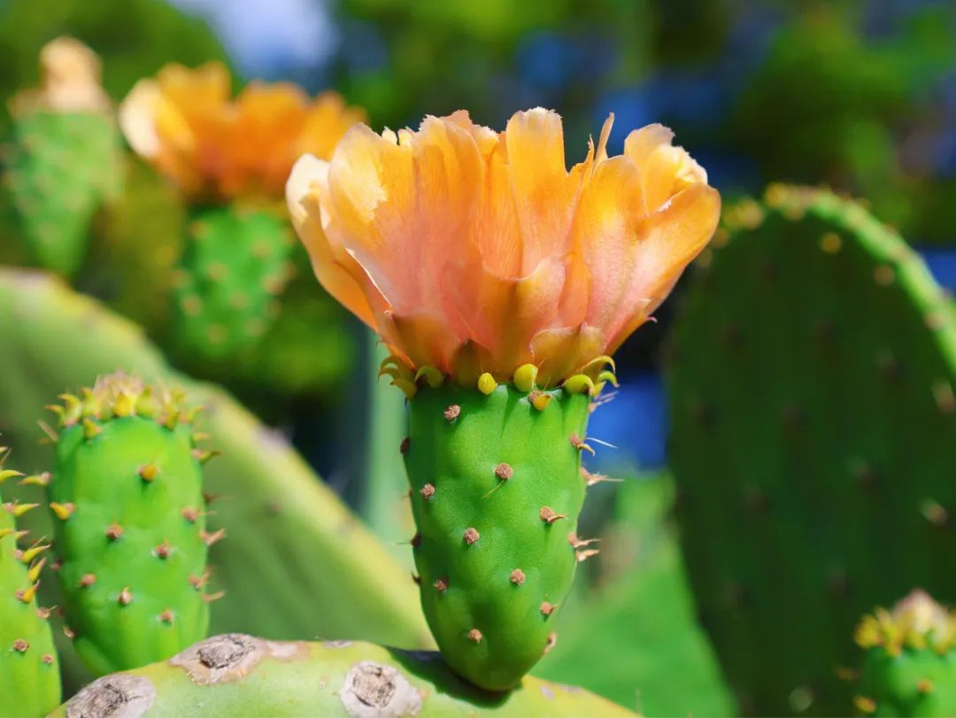 花儿在长满尖刺的仙人掌叶片上悄然盛开
