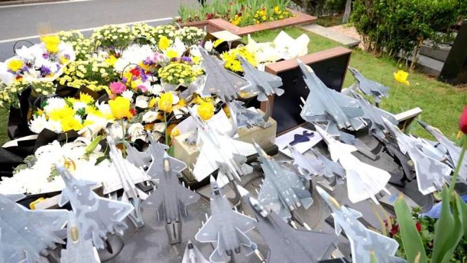 今年4月1日,王伟墓前摆满了鲜花和战机模型