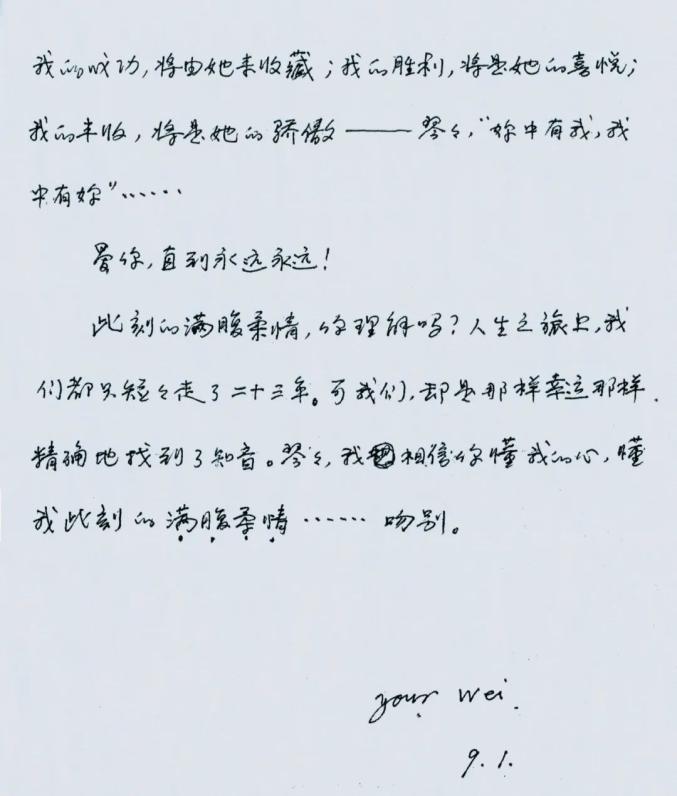 在给我的信中,他多次提及“一定要实现自己的飞行梦!”他说:“此生唯有飞行和你能左右我,你能置我于‘死地’,飞行能置我于‘死地’;你能给我最大的幸福和快乐,飞行也能。我爱飞行事业,同样爱着你。感情上,爱你胜过爱飞行;而理智上,我爱飞行要比爱你更甚。”“那银色的鸟,是我的第二爱人。我爱她,朝霞与她一同出航;我爱她,日落与她携手而归。梦里,常常出现的,是她和你。我不能,不能离开她,就像永远不能离开你——琴琴,你懂的,懂我这流浪的目的地。”
