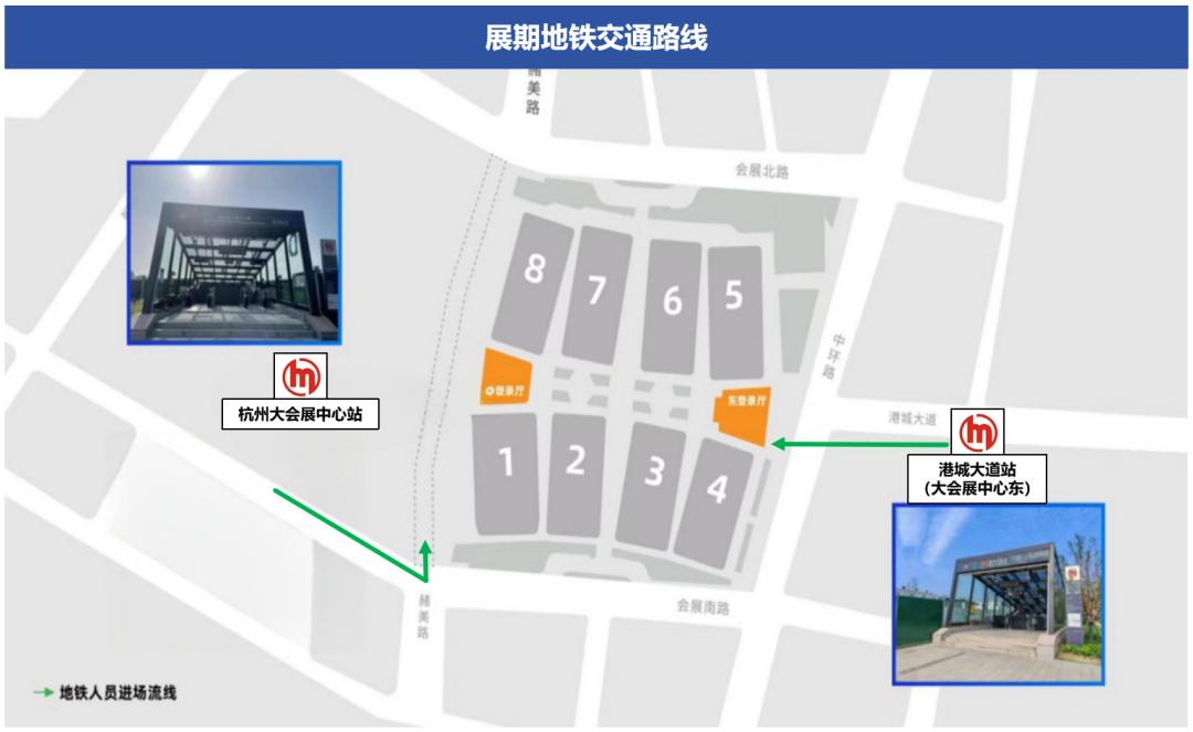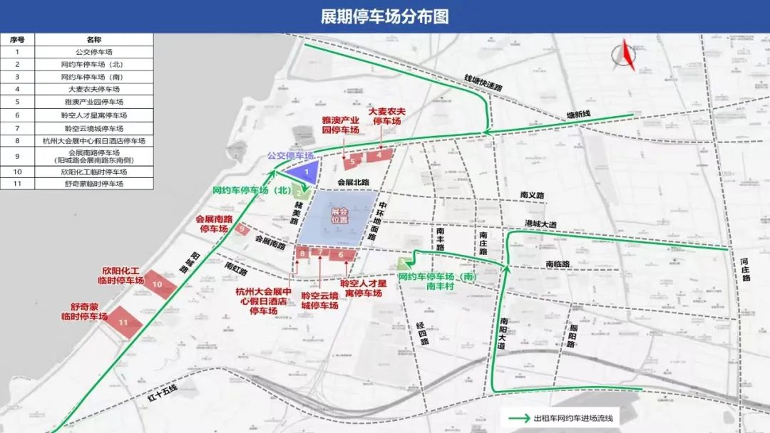 二、请前往大会展中心参加活动的市民朋友尽量乘坐地铁出行(1号线杭州大会展中心站、港城大道站抵达)。请网络预约出租车、巡游出租车至会展北路南侧杭州大会展中心P2地面停车场、会展南路南侧南丰村停车场2个专用停车场上下客;私家车可至大会展中心周边停车场停放,其中欣阳化工临时停车场、舒奇蒙临时停车场可换乘公交接驳车;过境车辆提前选择红十五线、建设四路、河庄路、青六线等周边道路绕行。