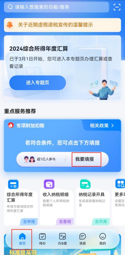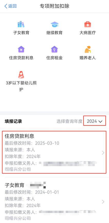 点击底部“首页”——点击重点服务推荐“专项附加扣除”模块的“我要填报”——查询年度修改为“2024”年度——点击查询到的“住房贷款利息”专项附加扣除。