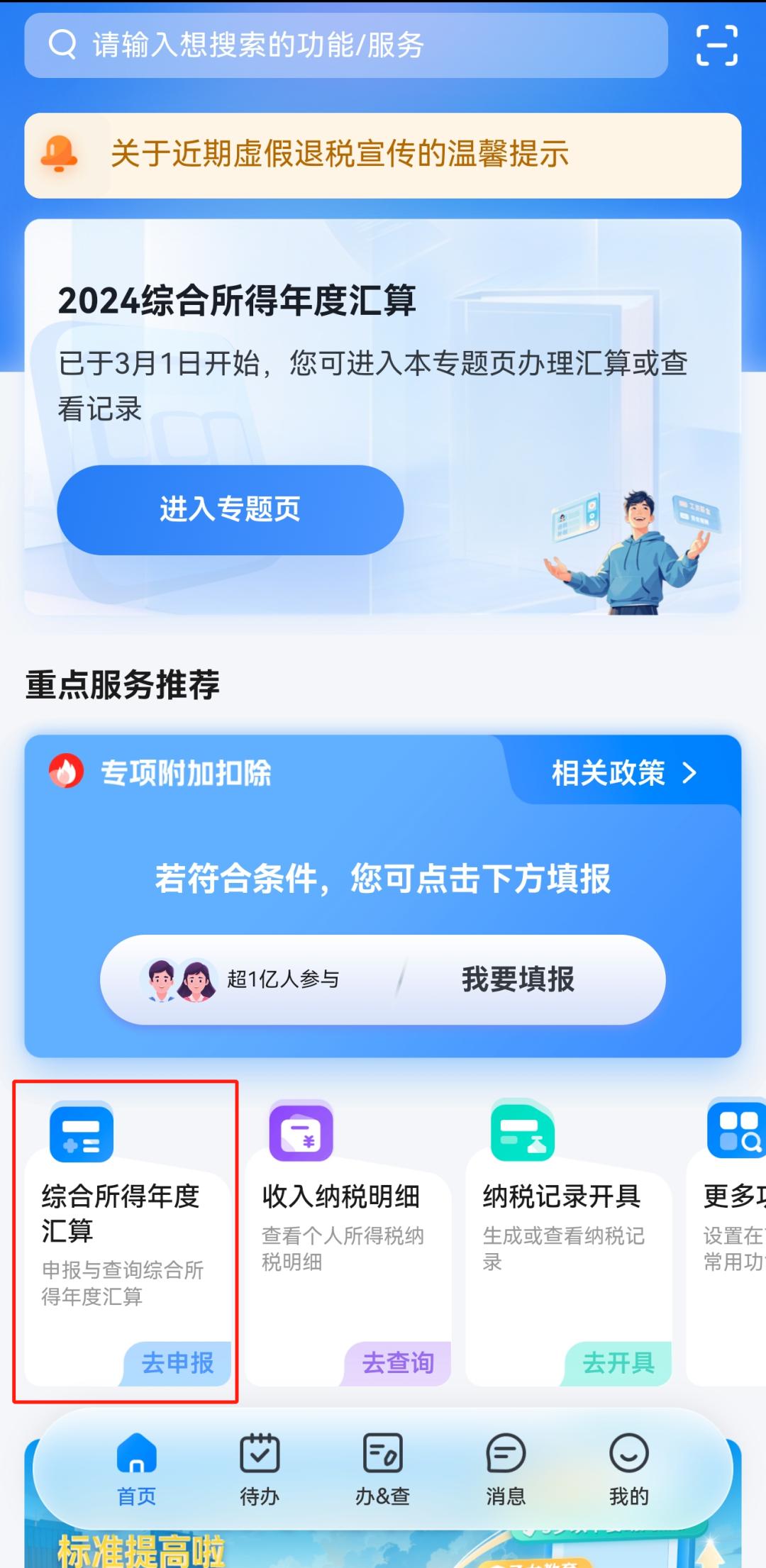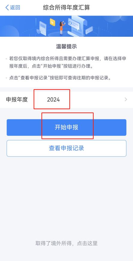 点击底部“首页”——点击“综合所得年度汇算”——点击“开始申报”。