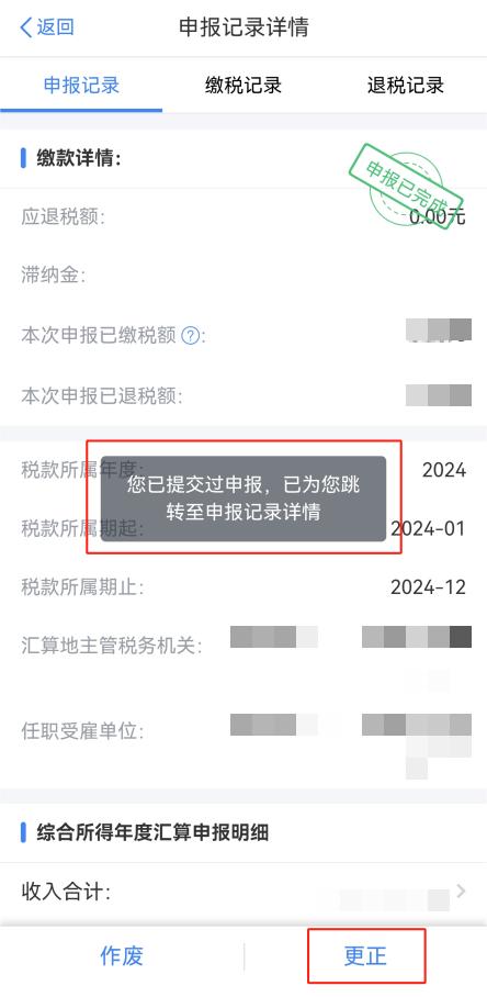 系统提示“您已提交过申报,已为您跳转至申报记录详情”——点击底部“更正”——点击“下一步”,如无其他需修改内容,一直点击“下一步”到提交申报即可,如有退税,可直接申请退税。