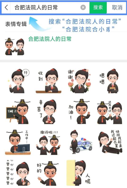 微信表情商店搜索“合肥法院人的日常”“合肥法院合小豸”操作步骤