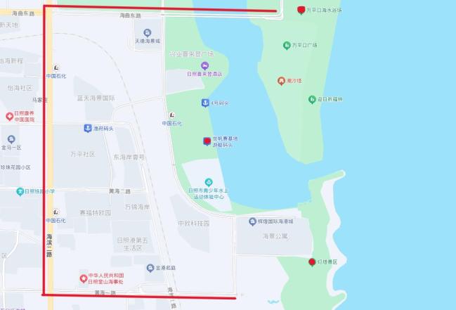 1.海曲东路与青岛路路口、海曲东路与绿舟路路口、黄海一路与海滨二路路口、黄海二路与海滨二路路口、黄海三路与海滨二路路口进行疏导分流,限制车辆向东、向南行驶。